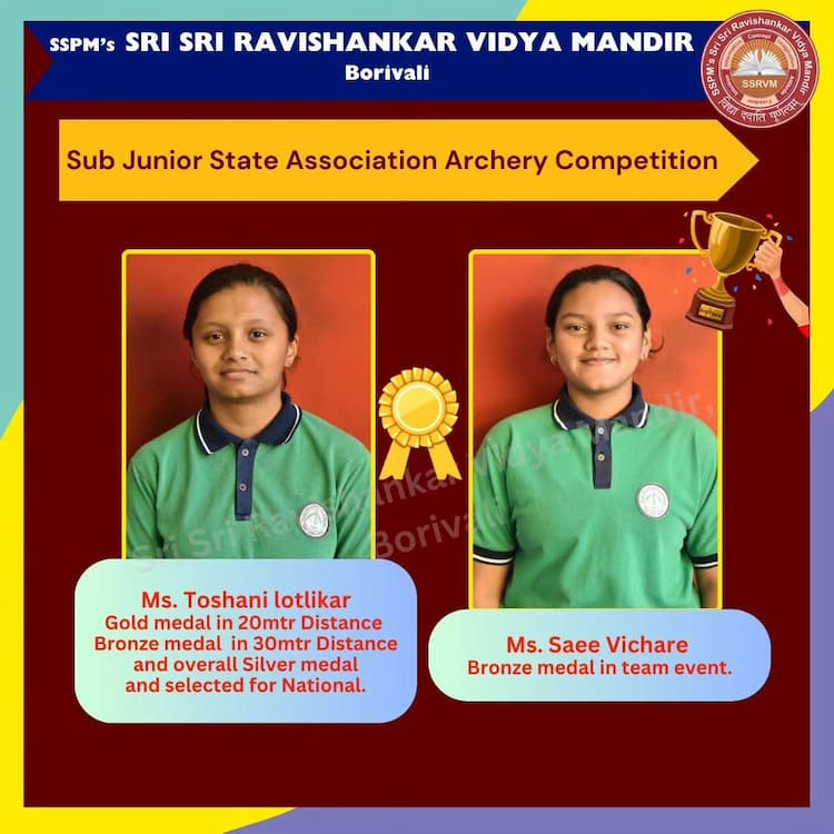 Sri Sri Ravishankar Vidya Mandir, Borivali proudly congratulates our phenomenal athletes for their outstanding performance at the Sub-Junior State Association Archery Competition held in Nashik! ✨ Ms. Toshani Lotlikar: Gold Medal in 20m Distance Gold Medal in Individual Elimination Match Bronze Medal in 30m Distance Overall Silver Medal Her exceptional achievements have secured her a place in the Nationals! The Mumbai Suburban Team also shone brightly, winning Bronze Medal in the Team Elimination Match! Team Members: • Ms. Toshani Lotlikar • Ms. Saee Vichare We are incredibly proud of their dedication, skill, and perseverance!